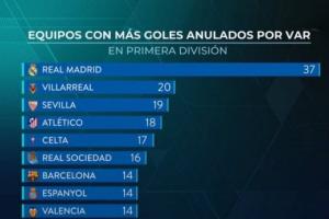 赛后皇马官方电台晒出图标,统计西甲被VAR取消的进球排名,其中皇马有37球被VAR取消,大幅领先排名第二的比利亚雷亚尔。