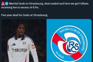 “富勒姆将获得超过700万欧元的转会费,戈多与斯特拉斯堡签约五年。”