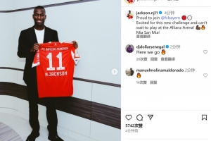杰克逊晒出手拿拜仁11号球衣的照片,并写道:“很自豪能加盟拜仁,对这个新挑战感到兴奋,迫不及待想要在安联球场踢球了!Mia San Mia!!”