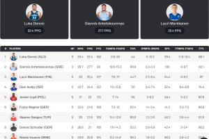 欧锦赛小组赛得分榜:东契奇场均32.4分傲视群雄 字母哥命中率逆天