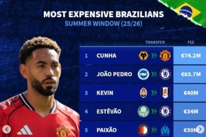 体育资讯9月8日讯 今夏主流联赛转会窗已经关闭,《转会市场》也列出了巴西球员的今夏转会费最贵情况。
