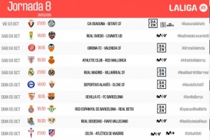 体育资讯9月9日讯 本周一,西甲联赛官方公布了本赛季联赛第8轮的赛程时间安排,比赛从10月4日03:00(北京时间,以下都是)到10月6日03:00。