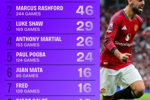 2.拉什福德 244场比赛 46次