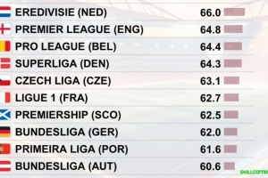 体育资讯9月20日讯 CIES盘点各联赛球员平均高强度跑动数据,荷甲第一。