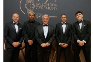 拉波尔塔、弗里克、亚马尔、拉菲尼亚、库巴西出席金球奖颁奖典礼,巴萨官方社媒晒出他们的合照,配文:“一个难忘的夜晚。”