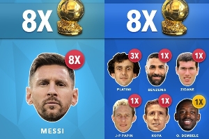 各国球员夺金球次数:阿根廷、法国8次并列第1 葡德荷7次 巴西5次
