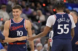 对此,快船记者Law Murray发推写道:“在哈登、莱昂纳德、祖巴茨身边搭配博格丹/巴图姆、琼斯/邓恩的8.5分钟里,勇士占据绝对优势,比分是27-14。之后快船换上了科林斯和大洛。”