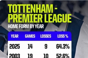14战9负!热刺今年联赛主场落败率64.3%,创造队史英超最差纪录