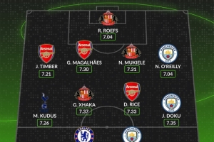 中场:库杜斯(热刺)、扎卡(桑德兰)、赖斯(阿森纳)、多库(曼城)